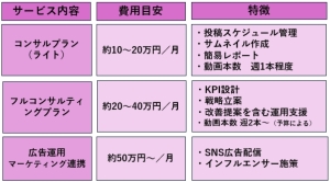 このように、月額10〜50万円前後が相場です。 チャンネルの成長や分析を重視する場合は、コンサルティングプランを選ぶと安定的な成果につながります。