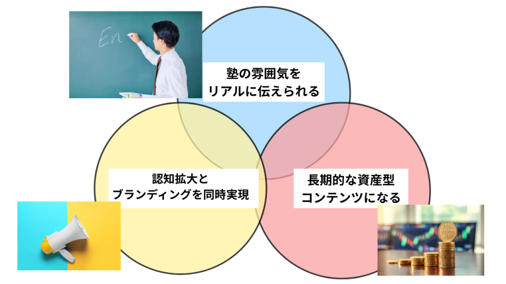 YouTubeは一度発信すれば価値が積み上がるメディアです。短期的な反応だけでなく、長期的な資産として塾のブランドを育てることができます。