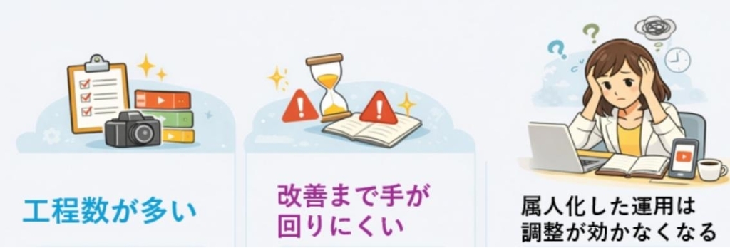 編集や確認を毎回その場で判断していると、作業時間が安定しません。1人運用では、作業量よりも判断回数の多さが負担になります。