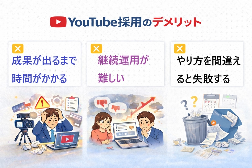 YouTubeは採用活動において多くのメリットがありますが、始めればすぐに成果が出るわけではありません。導入前に理解しておきたいデメリットを解説します。